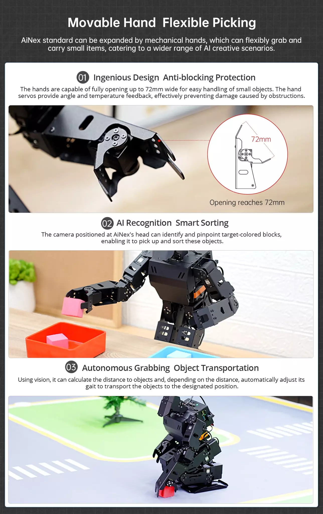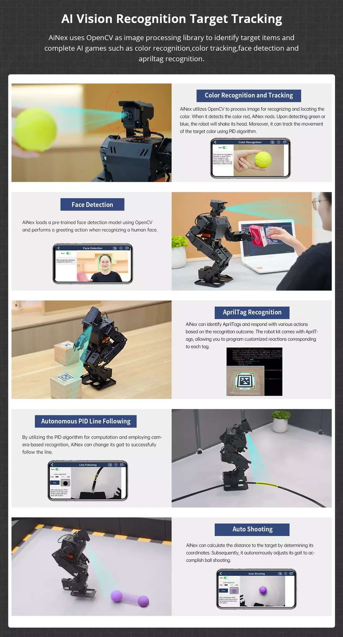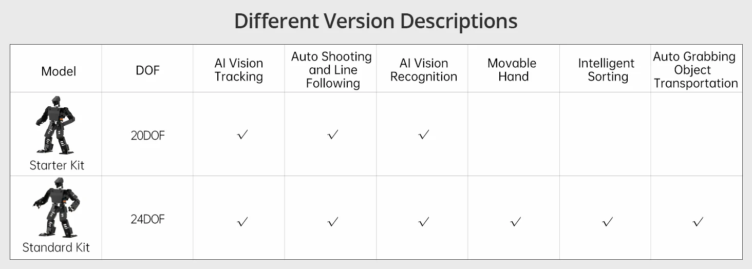 Med 24 rörelseaxlar (DOF) och intelligenta servomotorer kan AiNex utföra realistiska rörelser, gå, vända, plocka upp föremål och interagera med sin omgivning.