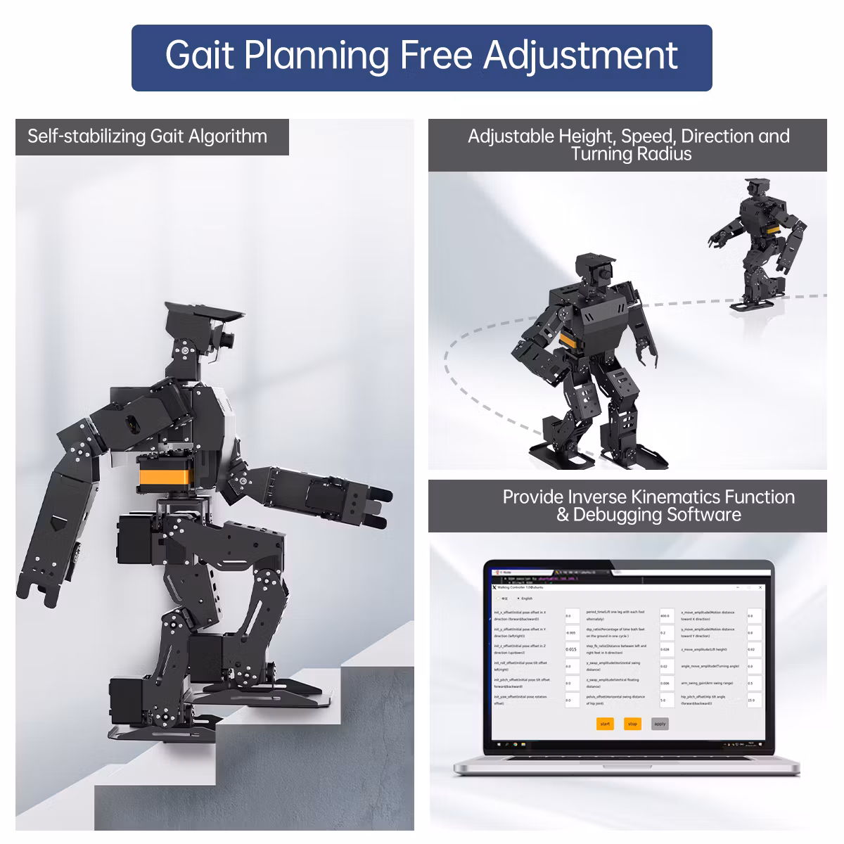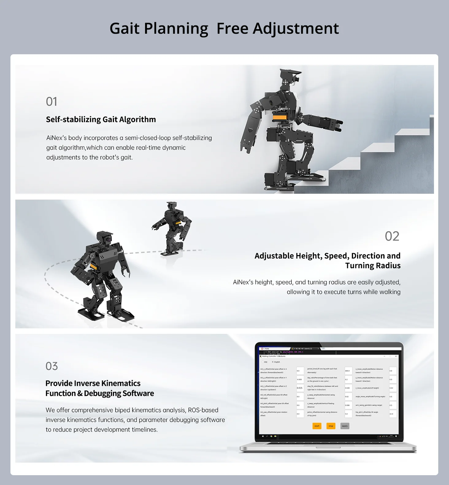 AiNex använder avancerade inverse kinematics-algoritmer för att planera rörelser och balans i realtid.