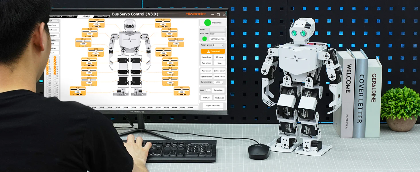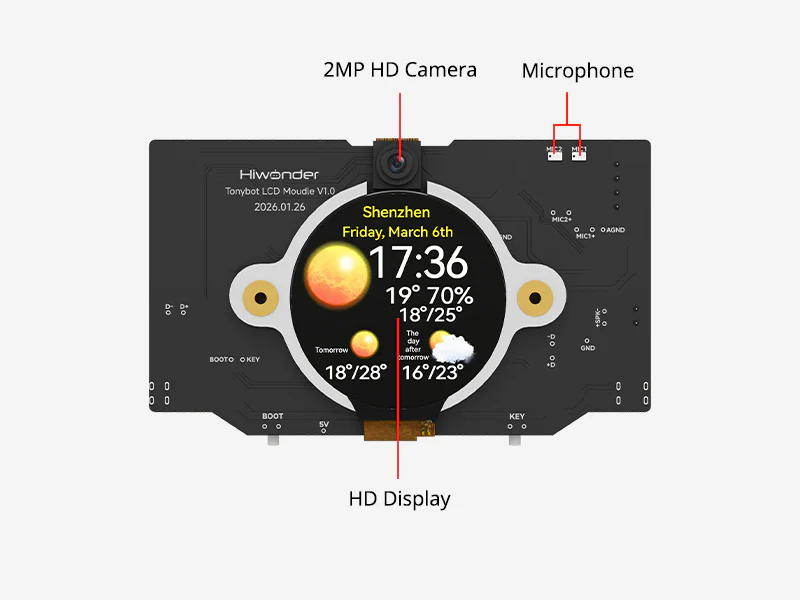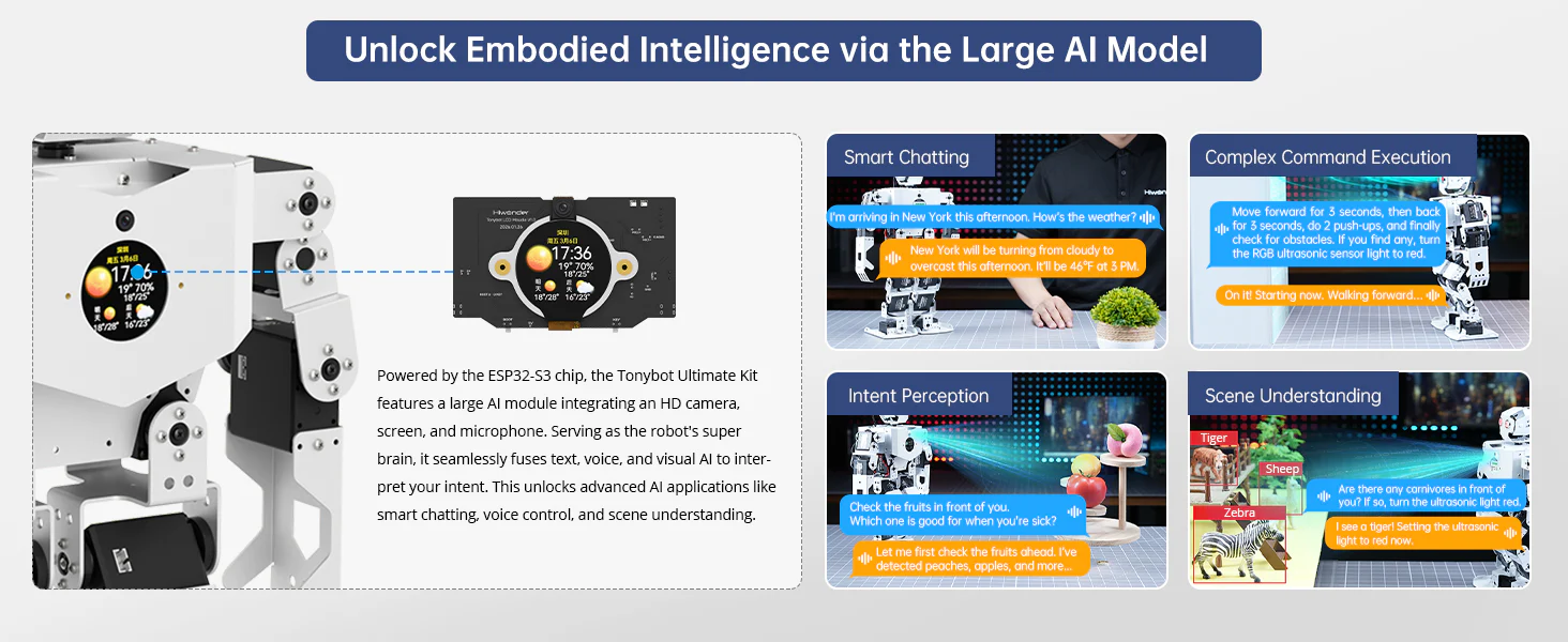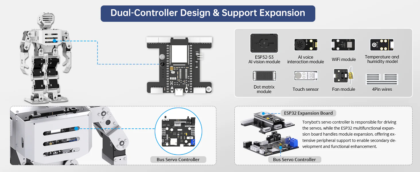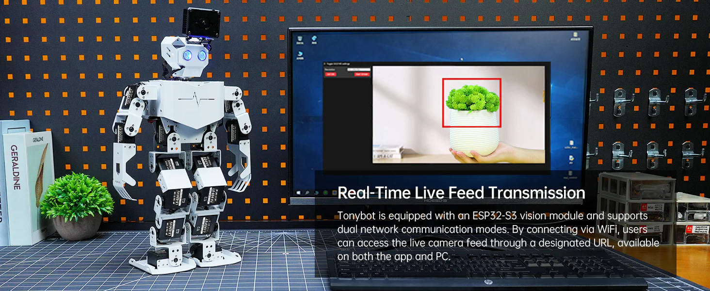 Hiwonder Tonybot är en avancerad humanoid robot utvecklad för robotik, AI och STEAM-utbildning. Roboten drivs av en kraftfull ESP32-plattform och är utrustad med intelligenta servomotorer som gör att den kan gå, dansa, utföra gymnastikrörelser och interagera med sin omgivning.